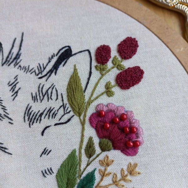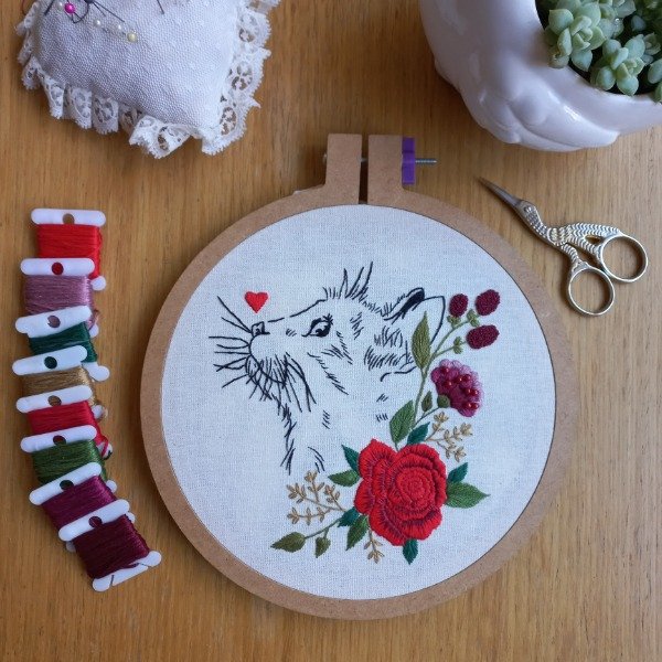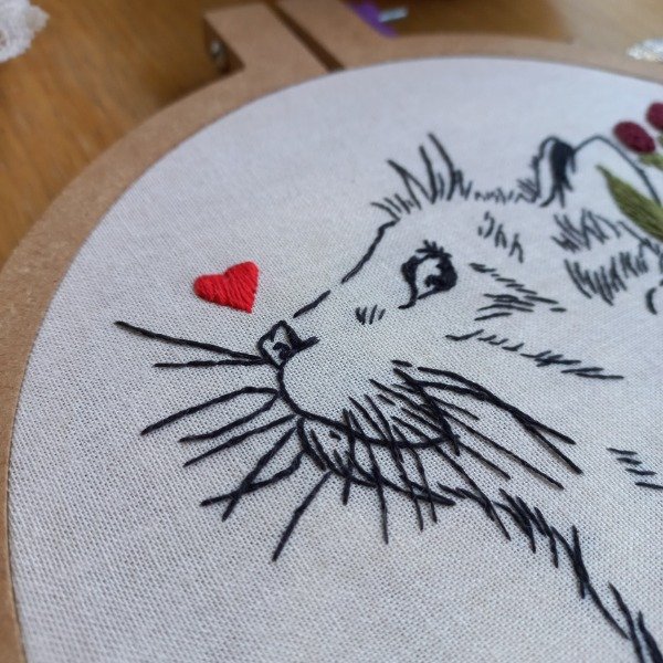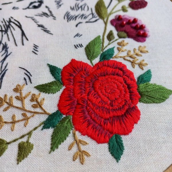 Bordado a mano con diseño de gato y flores 🐈🌹🌿🌺 Tiene un detalle muy lindo de mostacillas bordadas en una de las flores.