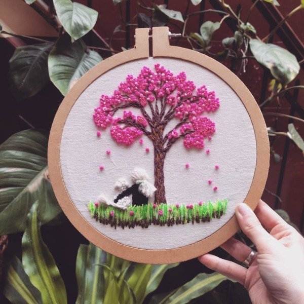 Bordado a mano sobre tela de lienzo color crudo, colocado en bastidor de fibrofácil de 20 cm.