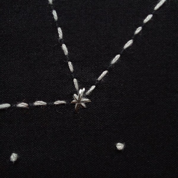 Realizado sobre tela de color negro , y bordado a mano con hilo blanco y detalles en color plateado.