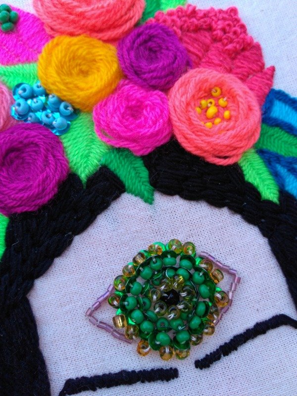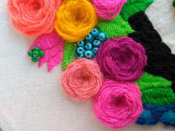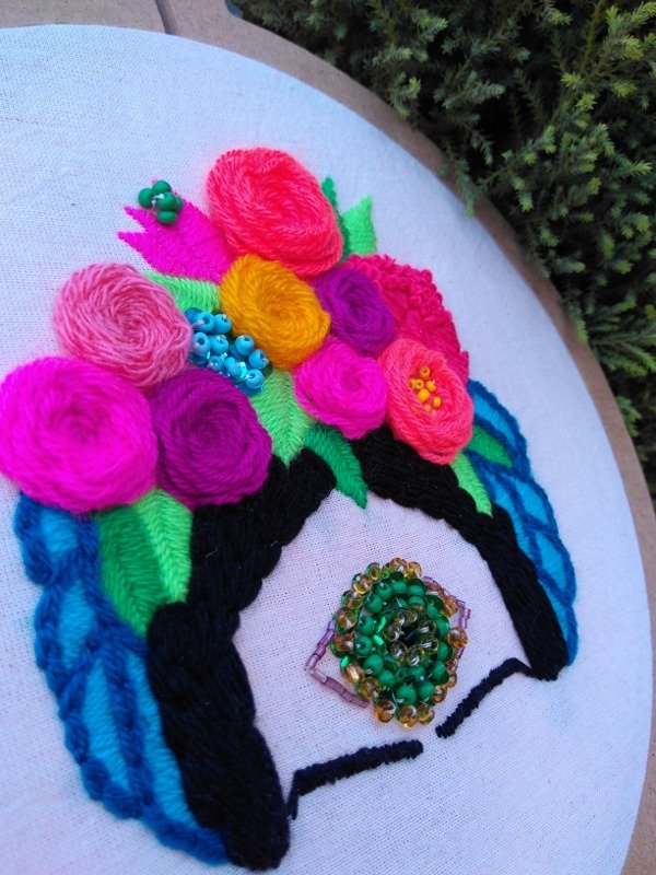 Bordado a mano sobre tela de lienzo color crudo, colocado en bastidor de fibrofácil de 20 cm.