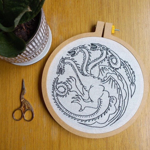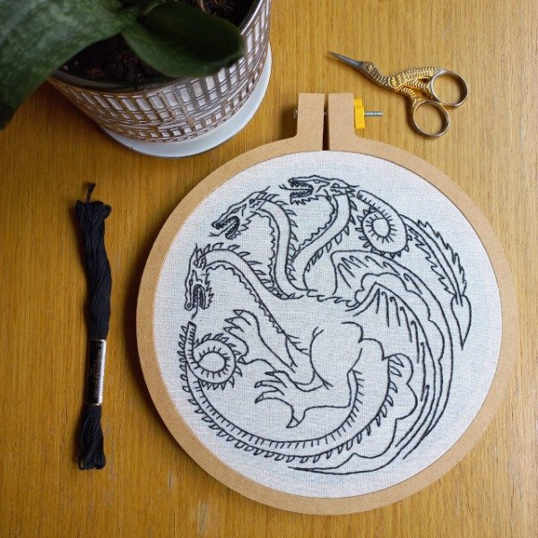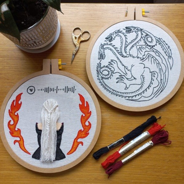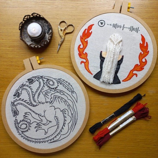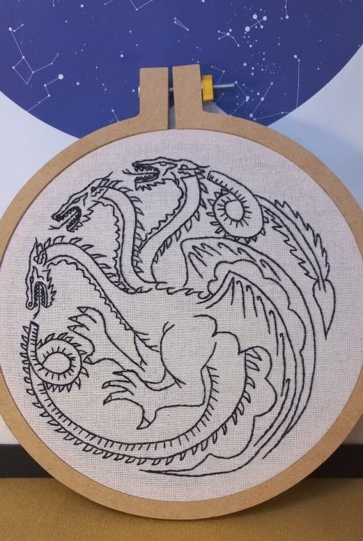 Bordado a mano con diseño de dragones inspirado en House of the Dragon y Game of thrones. 🐉👑