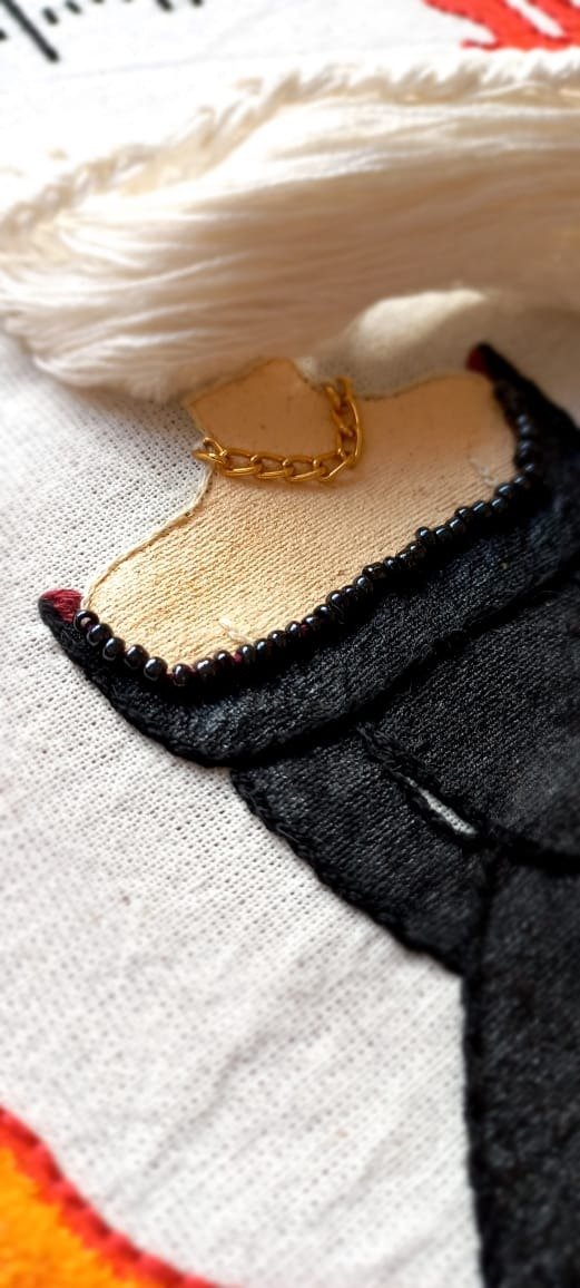 Realizado sobre lienzo color crudo con técnica de pintura, bordado a mano y detalles de mostacillas bordadas.