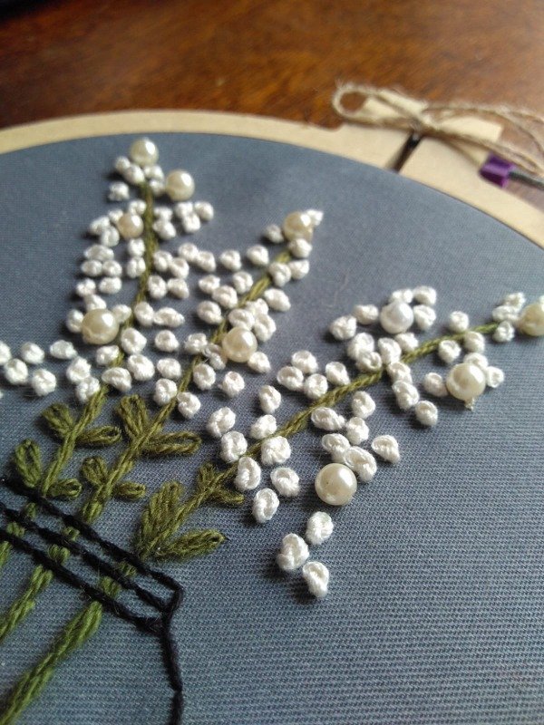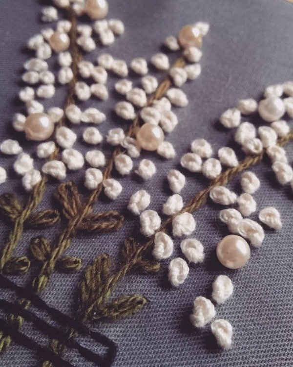 Bordado a mano realizado sobre tela gabardina color gris.
