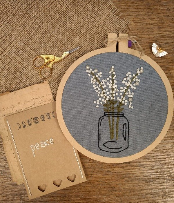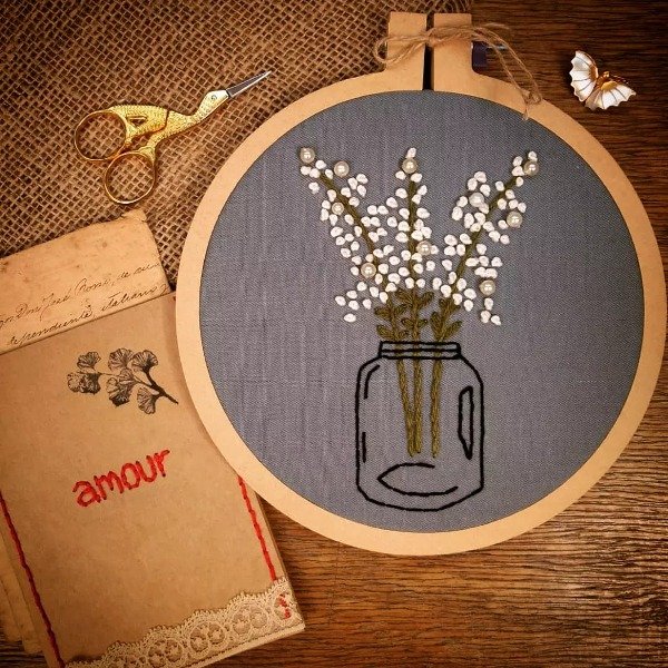 El diseño es de un frasco con flores y detalle de falsas perlas bordadas.