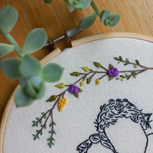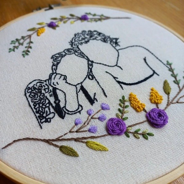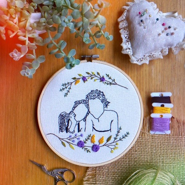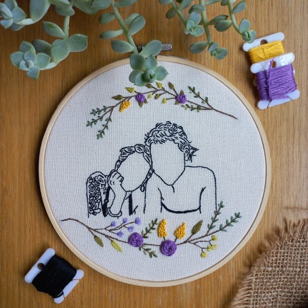 Los trabajos de este estilo consisten en realizar un bordado a partir de una fotografía. Los realizo con técnica de bordado de contornos para las siluetas y luego podemos complementar con detalles en bordado relleno (por ejemplo flores, hojitas, corazones, algún paisaje, etc) también podemos optar por agregarle detalles pintados a mano (con acuarela o acrílico)