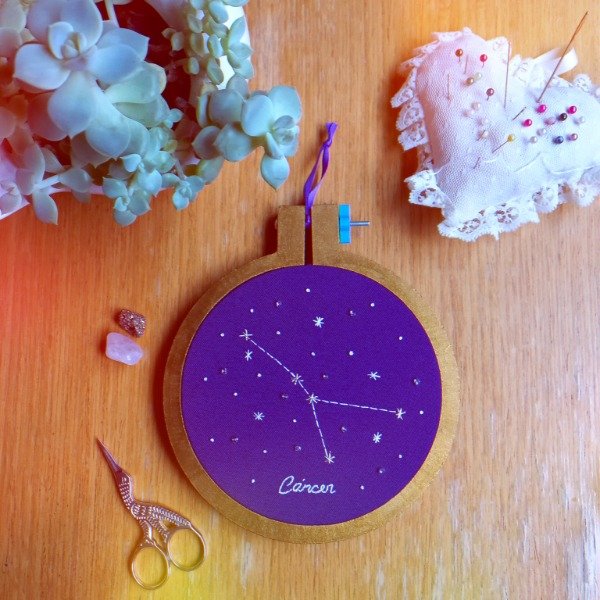 Bordado a mano con hilos de algodón y colocado en bastidor de fibrofácil de 14 o 16 cm.