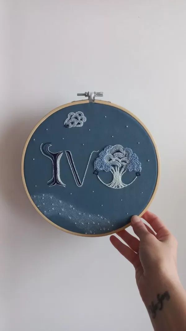 Este trabajo fue un pedido personalizado de Ceci, para regalarle a su sobrino Ivo con motivo de su nacimiento. A partir de unos dibujos que ella hizo con la idea que tenía en mente, armé el diseño definitivo. Fue realizado exclusivamente para el nombre Ivo.