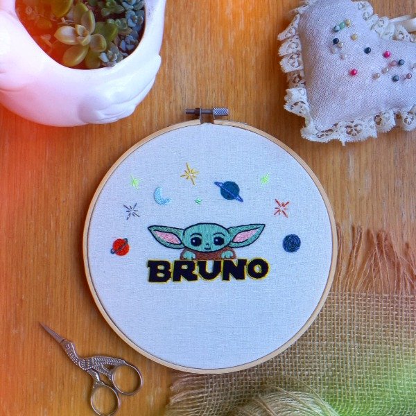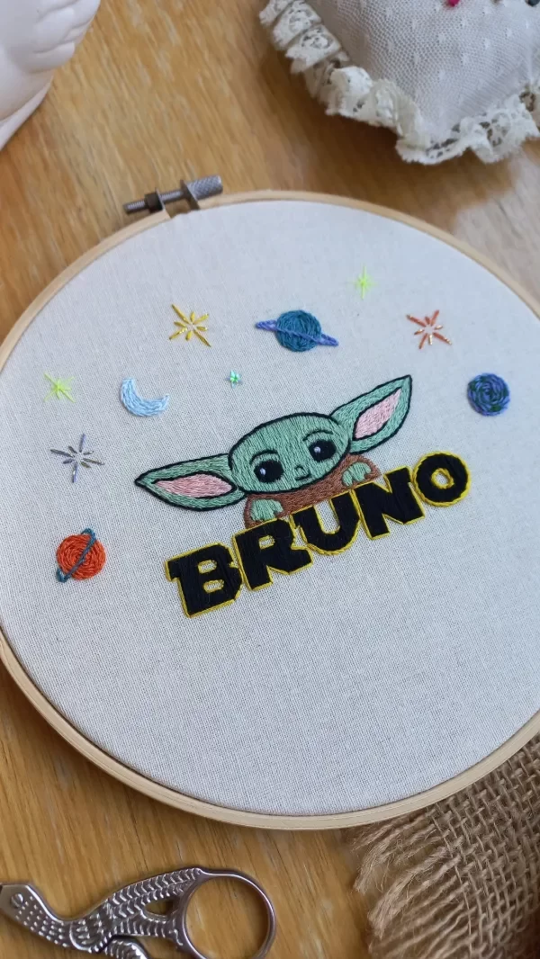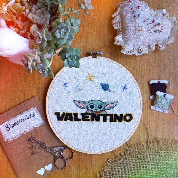 El bastidor del bordado de la imagen es de bambú pero también podes elegirlo con bastidor de fibrofácil.