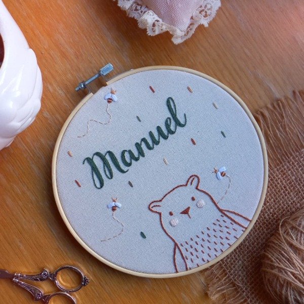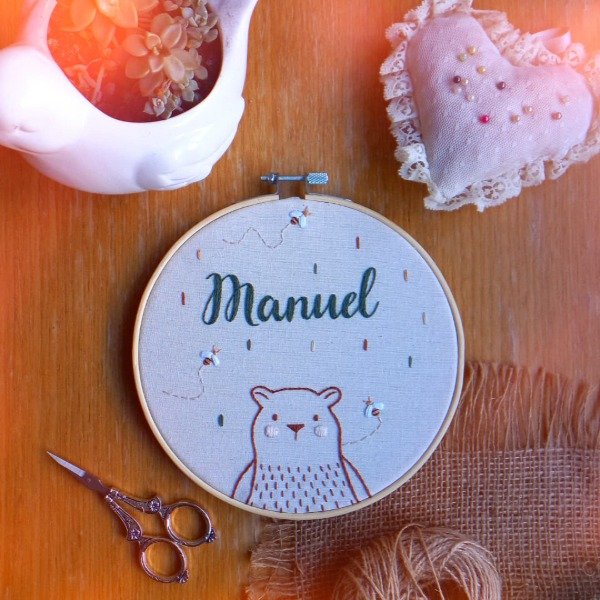 ACLARACIÓN IMPORTANTE: El trabajo es artesanal por lo tanto no hay dos bordados exactamente iguales, por ejemplo a veces puede variar el tono de los hilos o lanas, algún punto de bordado, el color de la pintura, algún detalle del diseño, etc.