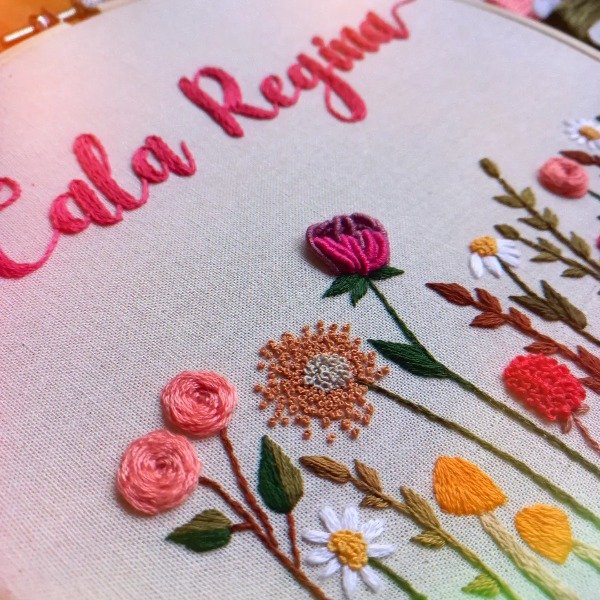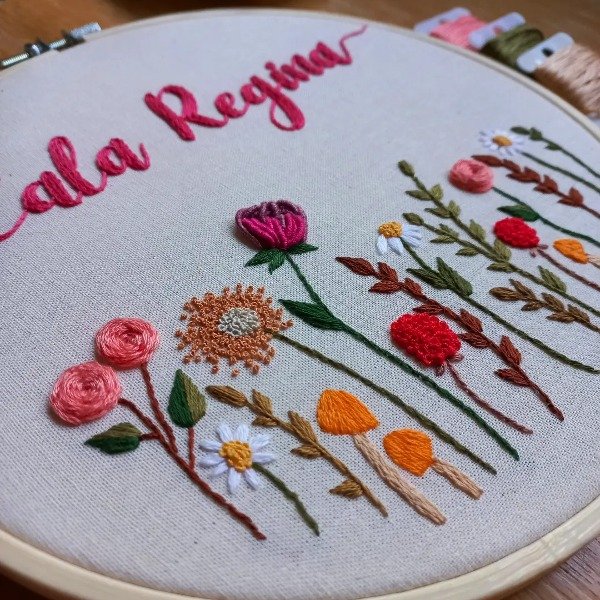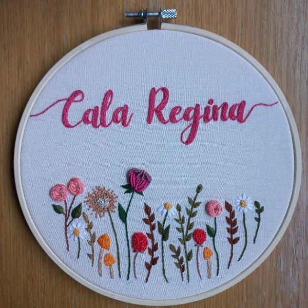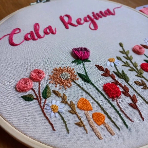 Bordado a mano realizado sobre lienzo con hilos de algodón.