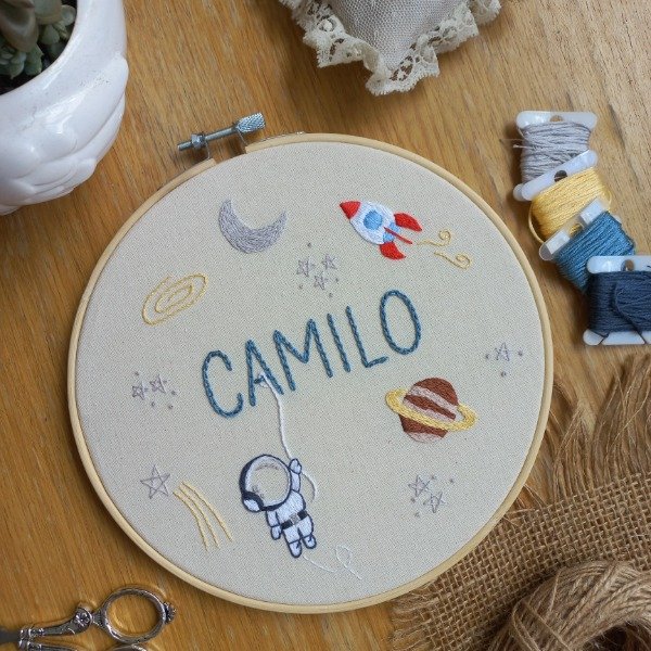 Cuadrito bordado a mano sobre lienzo con hilos de algodón, y montado en bastidor de 20 cm.
