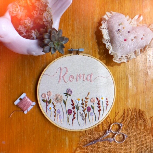 Predominan los tonos tierra y el nombre está bordado en color rosa y con una tipografía gruesa (en el listado de productos también vas a encontrar este mismo diseño pero con una tipografía más fina) Si queres este mismo diseño pero en otra paleta de color, escribime por mensaje privado de Instagram antes de realizar la compra.