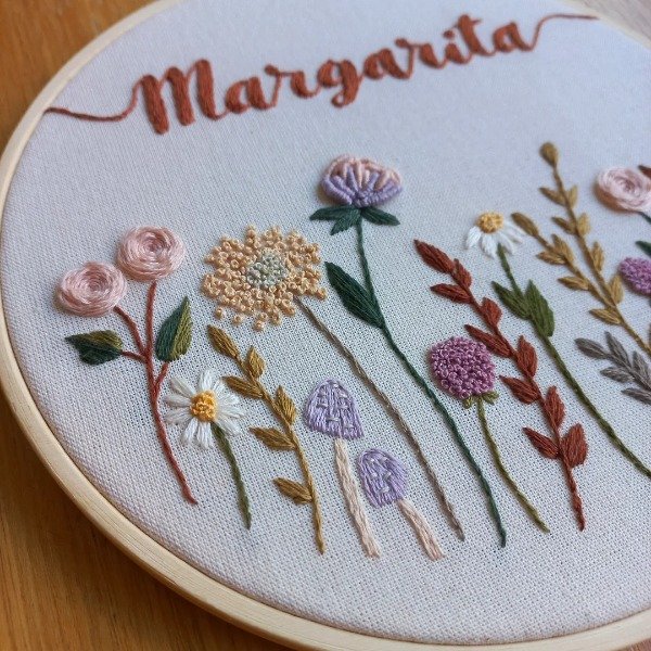 Bordado a mano realizado sobre lienzo con hilos de algodón.