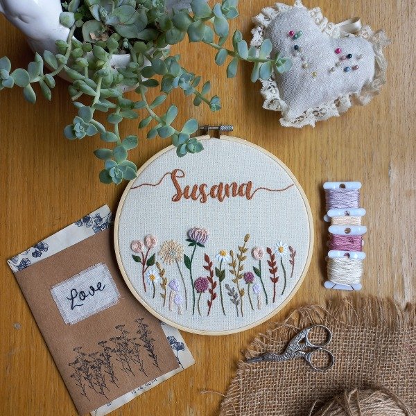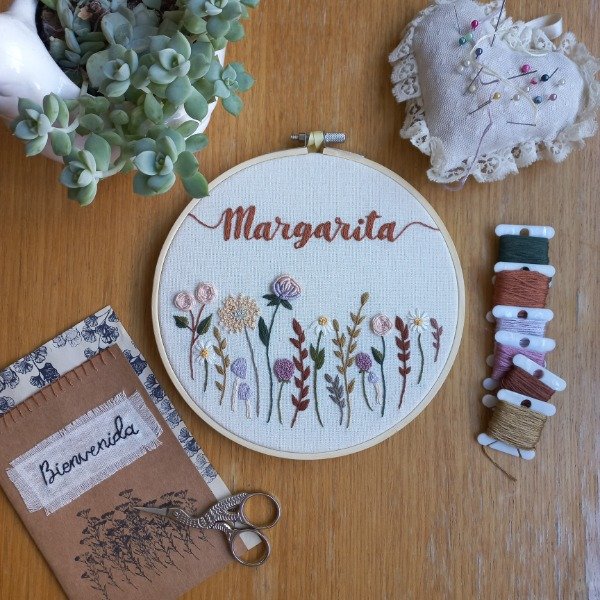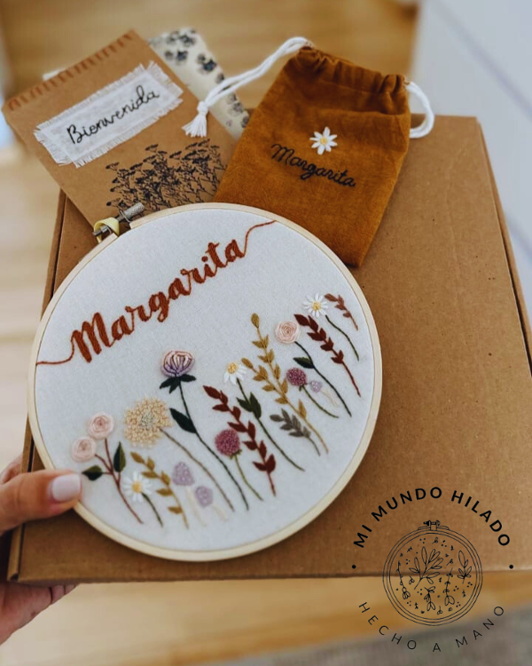 El bastidor del bordado de la imagen es de bambú pero también podes elegirlo con bastidor de fibrofácil.