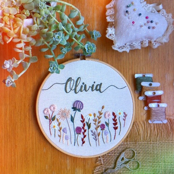 La paleta de colores es en tonos tierra y el nombre bordado en color verde.