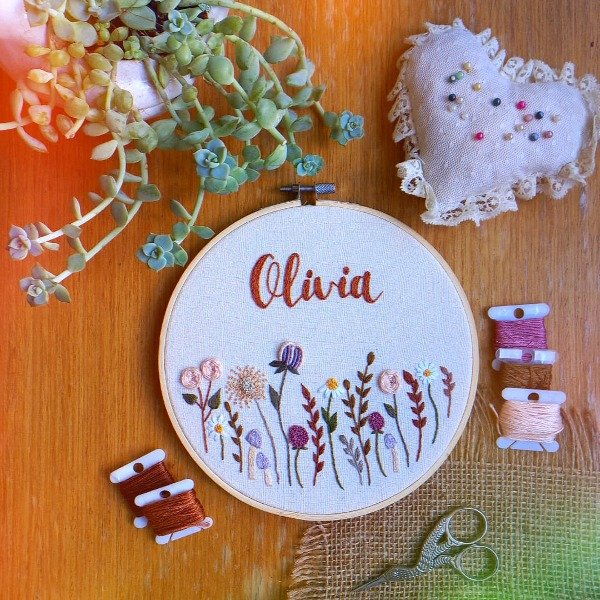 Cuadrito bordado a mano sobre lienzo con hilos de algodón, colocado en bastidor de 18 cm.