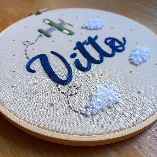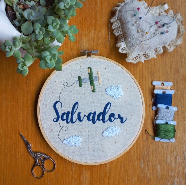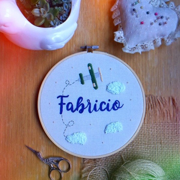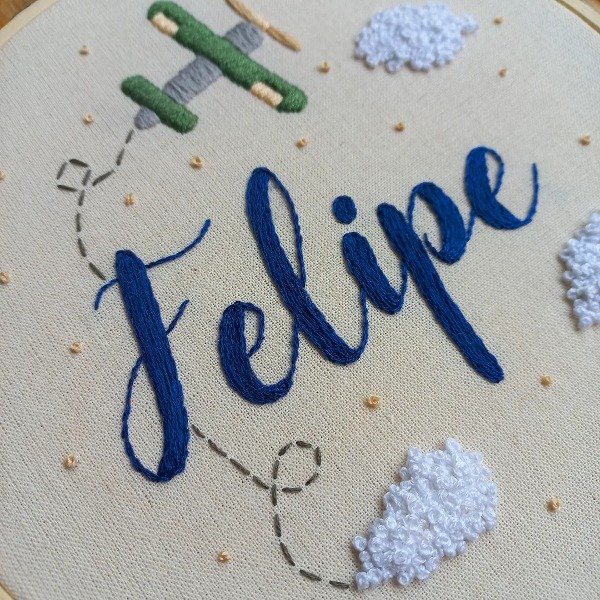 El avión está bordado en color verde y gris, y el nombre en color azul (si deseas modificar la paleta de color escribime por mensaje privado de Instagram o por WhatsApp antes de iniciar la compra)