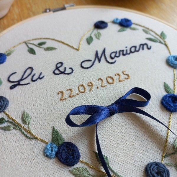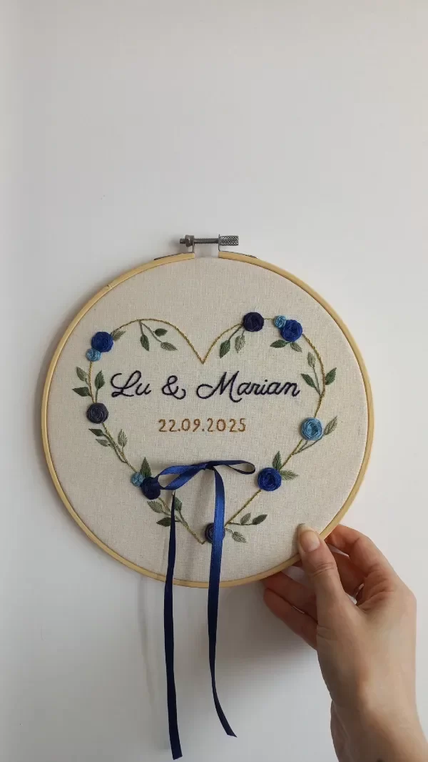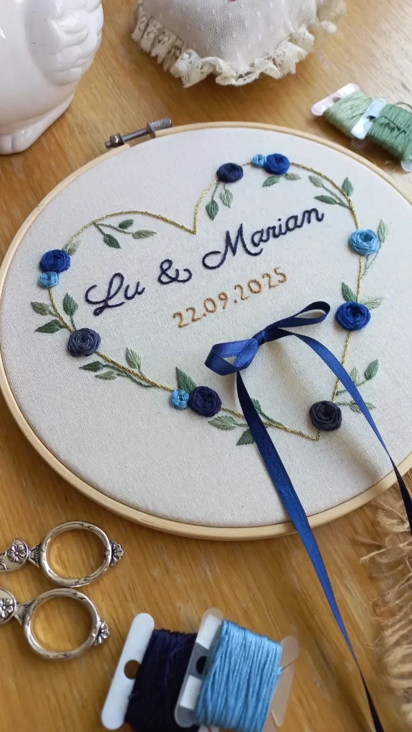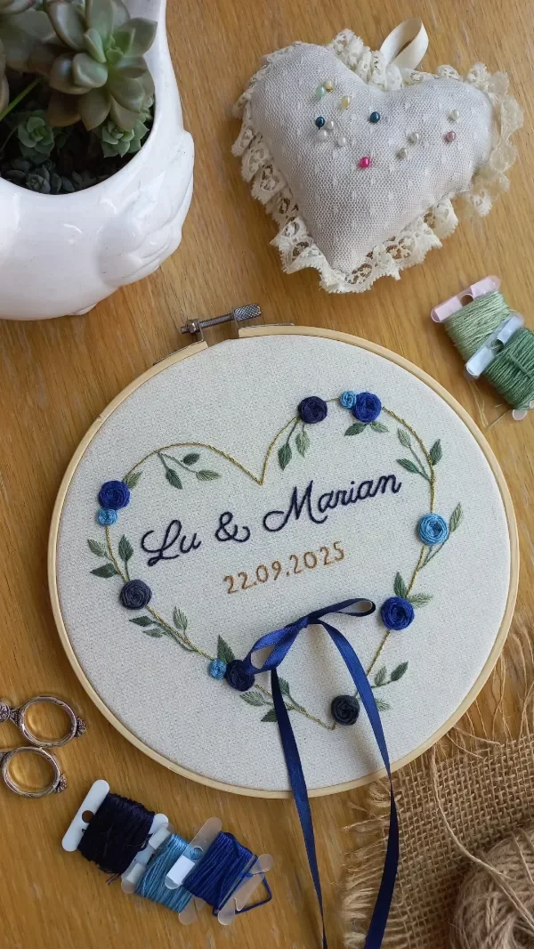 Cuadrito porta alianzas de boda, bordado a mano con hilos de algodón, y colocado en bastidor de 20 cm.